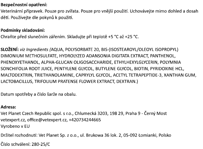 EXTRAKT BAOBABU – díky svým hydratačním a filmotvorným vlastnostem snižuje poškození struktury srsti způsobené vnějšími vlivy.