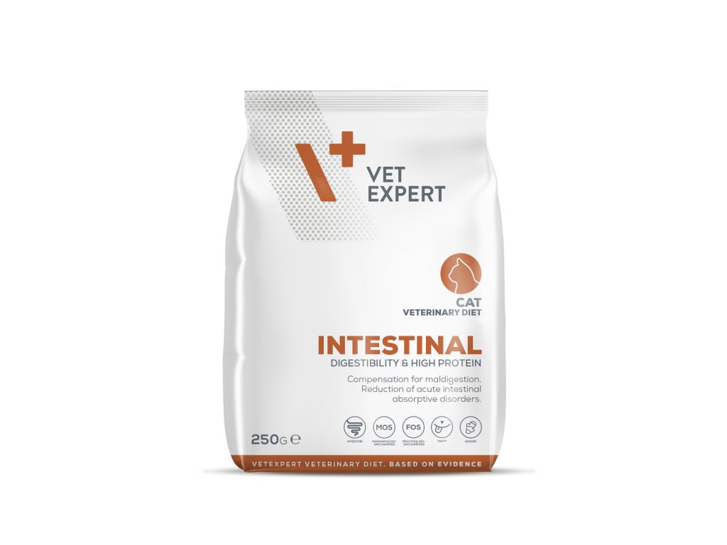 Kompletní a vyvážené dietetické krmivo pro kočky, jehož krmení se doporučuje ke kompenzaci a snížení poruch trávení a střevního vstřebávání.