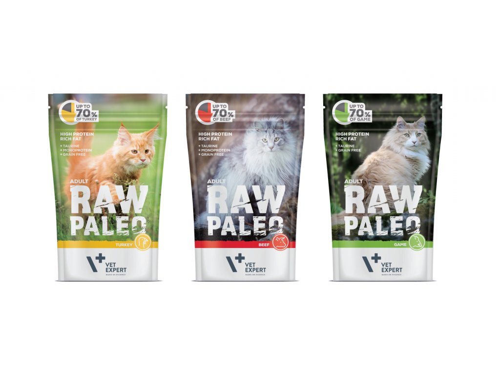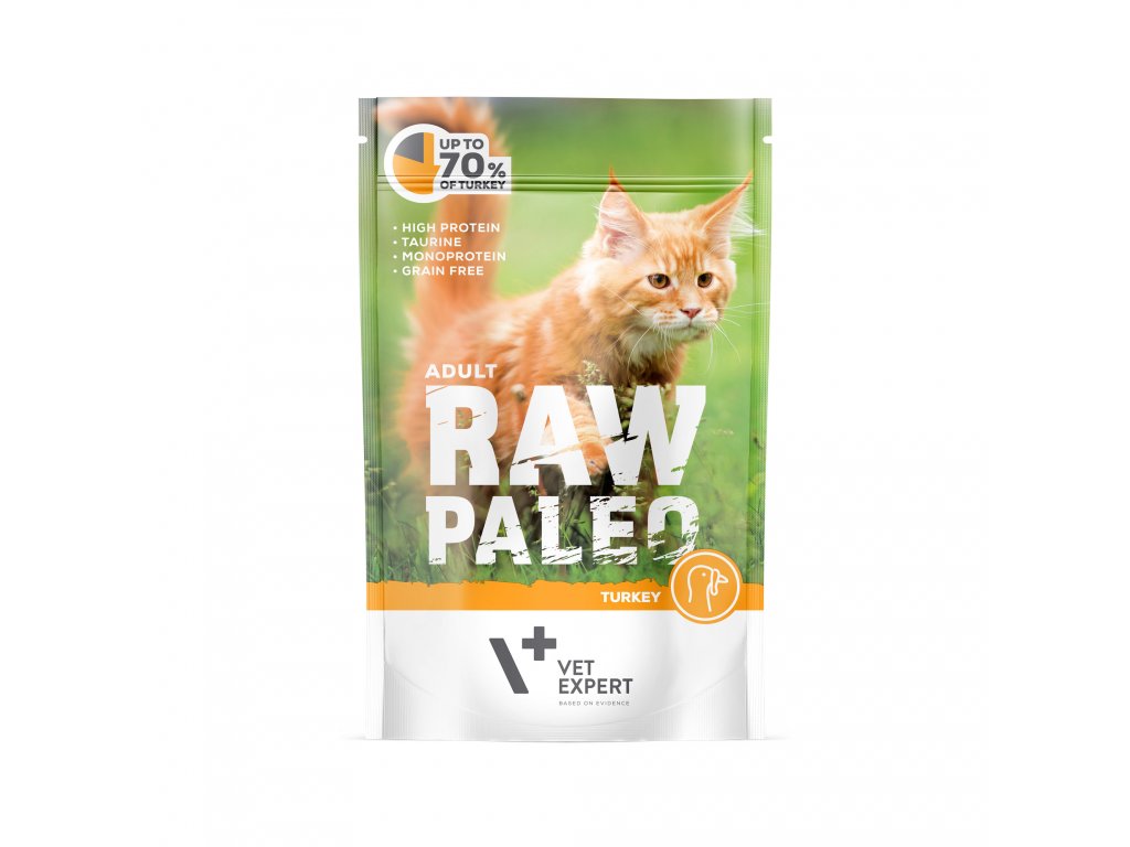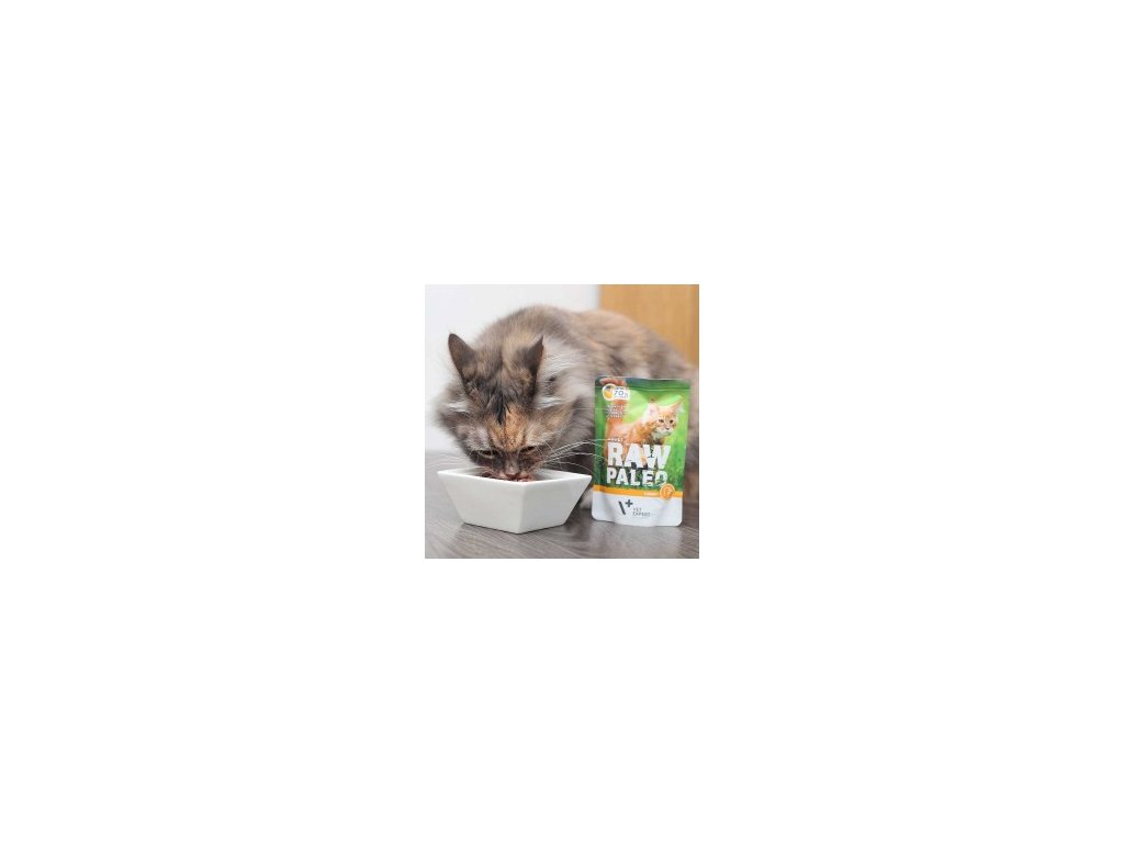 Vlhké krmivo RAW PALEO pro dospělé kočky je kompletní a vyvážené udržovací krmivo, určené pro dospělé kočky od 1 roku věku. Krmivo je bez obilnin a je jednoproteinové, což znamená, že všechny živočišné složky použité k výrobě jídla pocházejí z krůty.