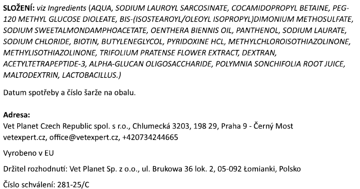 - Jemná textura šamponu je založena na vybraných přírodních čisticích složkách, které jemně čistí pokožku a srst.
